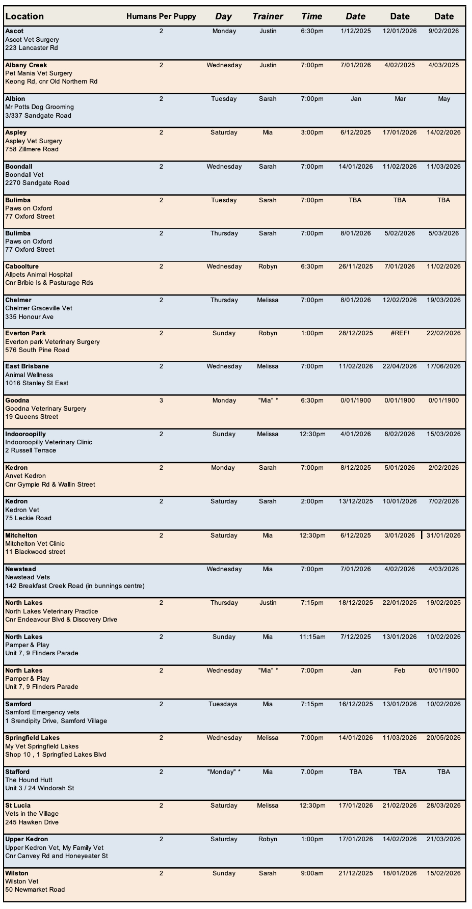 - Albany Creek, Pet Mania Vet Surgery, Wednesday, 7:00pm – 8:00pm (click here for availability & to book) with trainer Justin